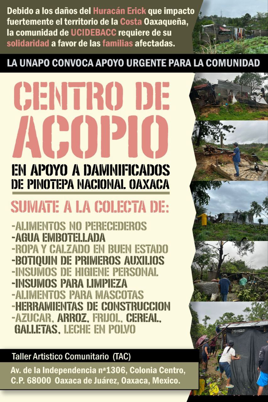 La comunidad de Ucidebacc como muchas otras comunidades de la costa necesitan de la solidaridad de todxs para volver a levantarse después de los daños provocados por el Huracán “Erick” que impactó con fuerza en Pinotepa Nacional. UNAPO habilitó un Centro de acopio en la ciudad de Oaxaca en el Taller de Arte Comunitario TAC, ubicado en Avenida Independencia #1306, Col. Centro. Con un horario de 11 AM a 8 PM